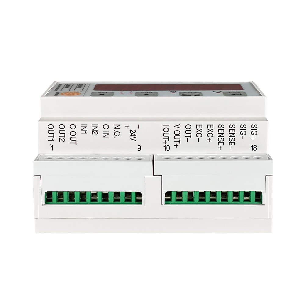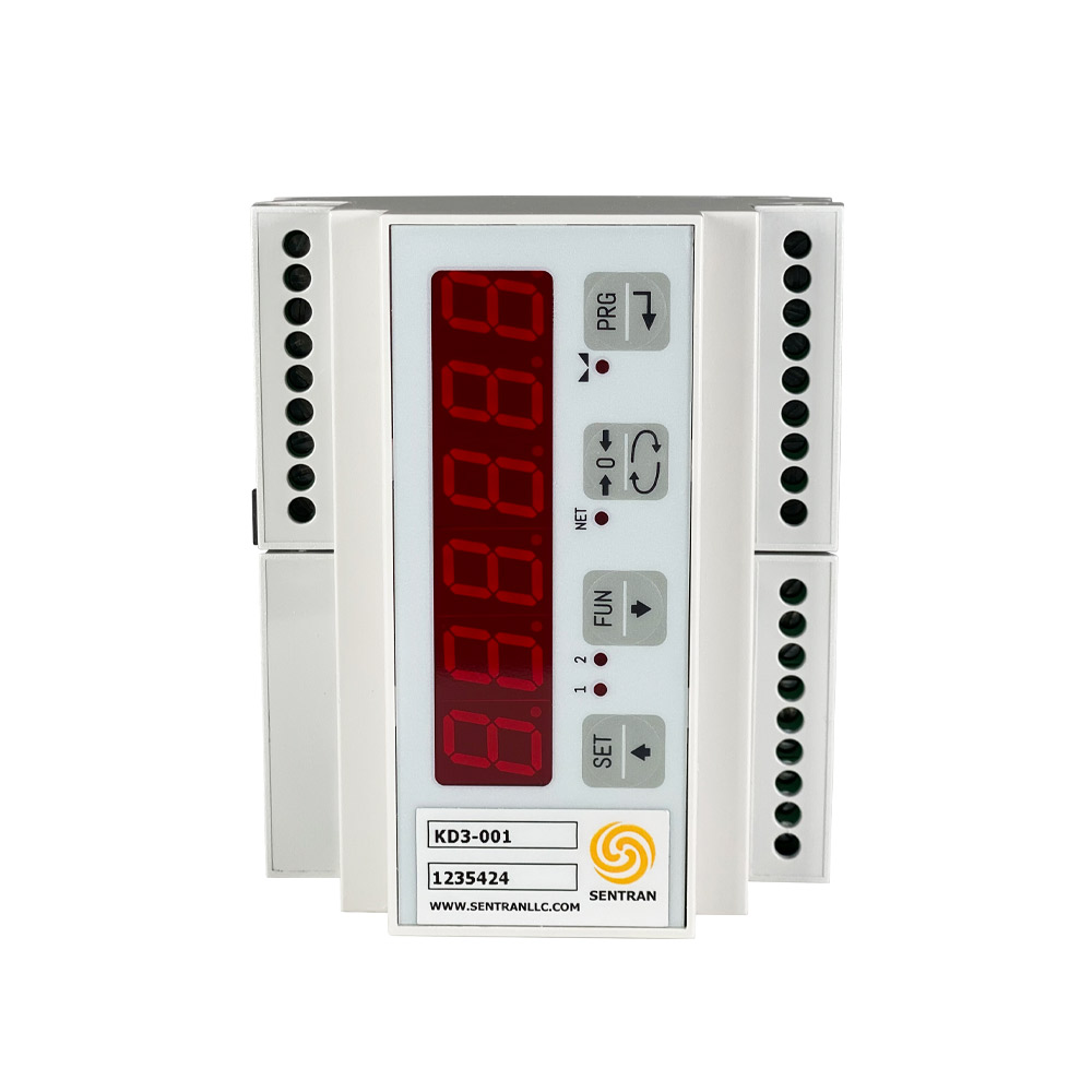 The KD3 Series is a high performance, multi-featured DIN rail mount digital controller designed as a companion instrument for load cells, force and torque transducers, and weighing systems. Two calibration options are available: Digital (keypad entry), or analog (reference signal). RS232/422/485 serial interfaces are supported. MODBUS® RTU protocol is standard and Ethernet TCP is an available option. KD3 Series utilizes a high resolution 24-bit input D/A with a 16-bit output D/A for the standard 0-5 VDC, 0-10 VDC, 0-20 mA, and 4-20 mA configuable outputs. A Bipolar option is also available with ± 5 VDC and ± 10 VDC configurable outputs. Remote sensing is supported, which is particularly beneficial where long cable runs or Intrinsic Safety barriers are employed. The KD3 series operates on 24 VDC power and includes digital I/O with two optically-isolated logic inputs and two optically-isolated logic outputs. Optional Innovation® is an MS Windows-based software, providing an intuitive and convenient tool for PC Setup/Control/ Networking. The attributes of the KD3 Series digital controller is ideal for measurements in the laboratory, manufacturing, process applications, weighing situations, and for general measurement and control.