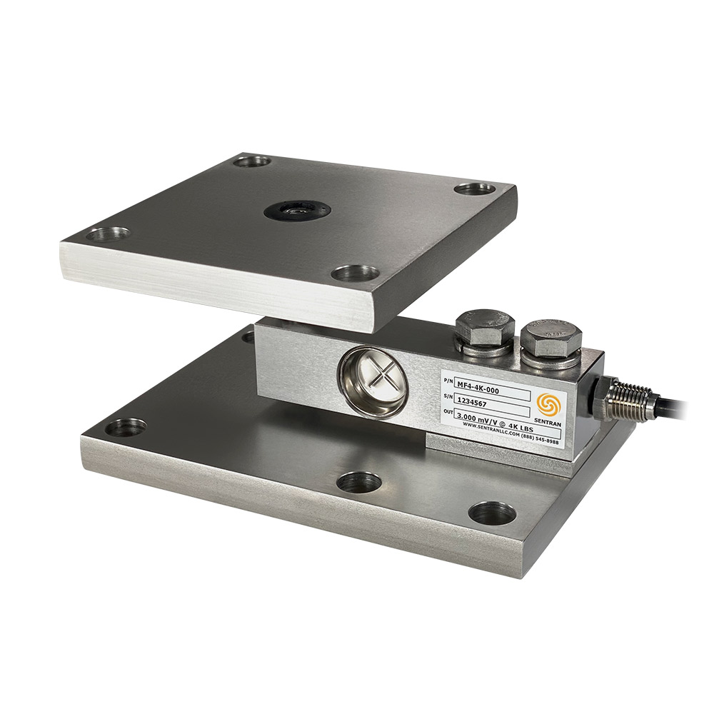 The MF4 Series is a high performance weigh module constructed of stainless steel. The MF4 utilizes the XA4-C Series shear beam load cell that readily tolerates angular, eccentric, and side loading effects, with minimal sensitivity to these anomalies. The MF4 Series is designed to accurately measure compression forces for applications ranging from 0-500 LB to 0-10,000 LB. The optional neoprene LRP (load receiver pad) promotes equal load distribution between adjacent weigh modules and reduces the effects of shock loading and vibration. The MF4 Series load receiver plate articulates 4° in all directions, allowing intrinsic planar misalignment compensation, accommodating vessel support alignment, sloped flooring, thermal expansion/contraction, and other installation variables. This easy-to-install weigh module mounts directly to the floor or structural supports, and is completely self-checking, including uplift constraint with accurate (tension) measurement. The MF4 Series weigh module is Harsh Environment Sealed to IP68 incorporating welded drawn covers to protect all internal components. An integral conduit adapter facilitates sealing and protecting the cable in conduit for increased enviromental protection. The integral premium, instrumentation grade cable features a durable PVC jacket over a tinned-copper braided shield for superior mechanical protection and to minimize the unwanted electrical effects of RFI and EMI. The attributes of the MF4 Series make it an ideal choice for measurement in C-I-P (Clean in Place) process, heavy washdown and corrosive applications, reactor, mixer and blender applications where a IP68 sealed, high performance weigh module solution is required.