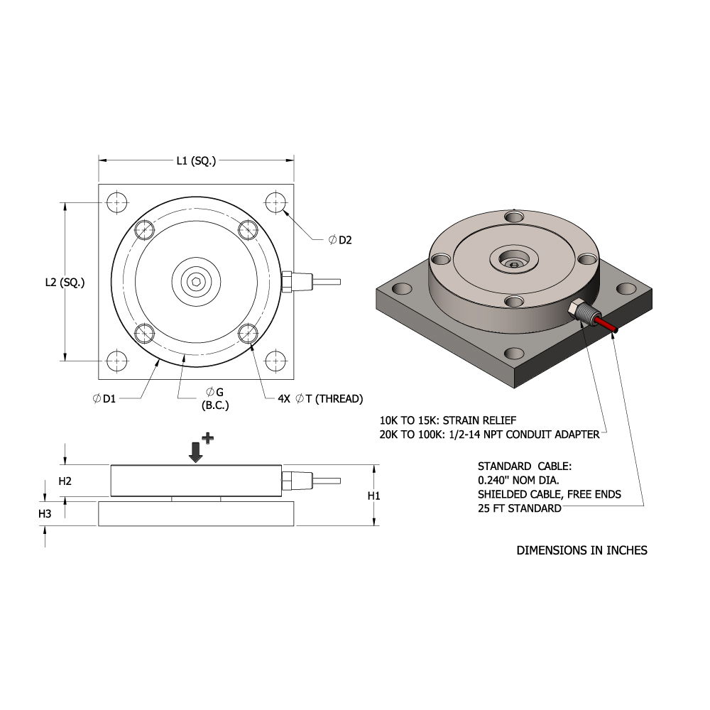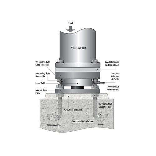 The ML3-A Series is a high performance weigh module constructed of stainless steel. The ML3-A utilizes a low profile diaphragm load cell. The ML3-A Series is designed to accurately measure compression forces for applications ranging from 0-10,000 LB to 0-100,000 LB. The top load receiver plate is optional. An optional neoprene LRP (load receiver pad) is also available that promotes equal load distribution between adjacent weigh modules and reduces the effects of shock loading and vibration. The ML3-A Series load receiver plate articulates 3° in all directions, allowing intrinsic planar misalignment compensation, accommodating vessel support alignment, sloped flooring, thermal expansion/contraction, and other installation variables. This easy-to-install weigh module mounts directly to the floor or structural supports, and is completely self-checking, including uplift constraint with accurate (tension) measurement. The ML3-A Series weigh module is Harsh Environment Sealed to IP68 incorporating welded covers to protect all internal components. An integral conduit adapter (20K-100K LB))facilitates sealing and protecting the cable in conduit for increased enviromental protection. The integral premium, instrumentation grade cable features a durable polyurethane jacket over a tinned-copper braided shield for superior mechanical protection and to minimize the unwanted electrical effects of RFI and EMI. The attributes of the ML3-A Series make it an ideal choice for measurement in C-I-P (Clean in Place) process, heavy washdown and corrosive applications, reactor, mixer and blender applications where a IP68 sealed, high performance weigh module solution is required.