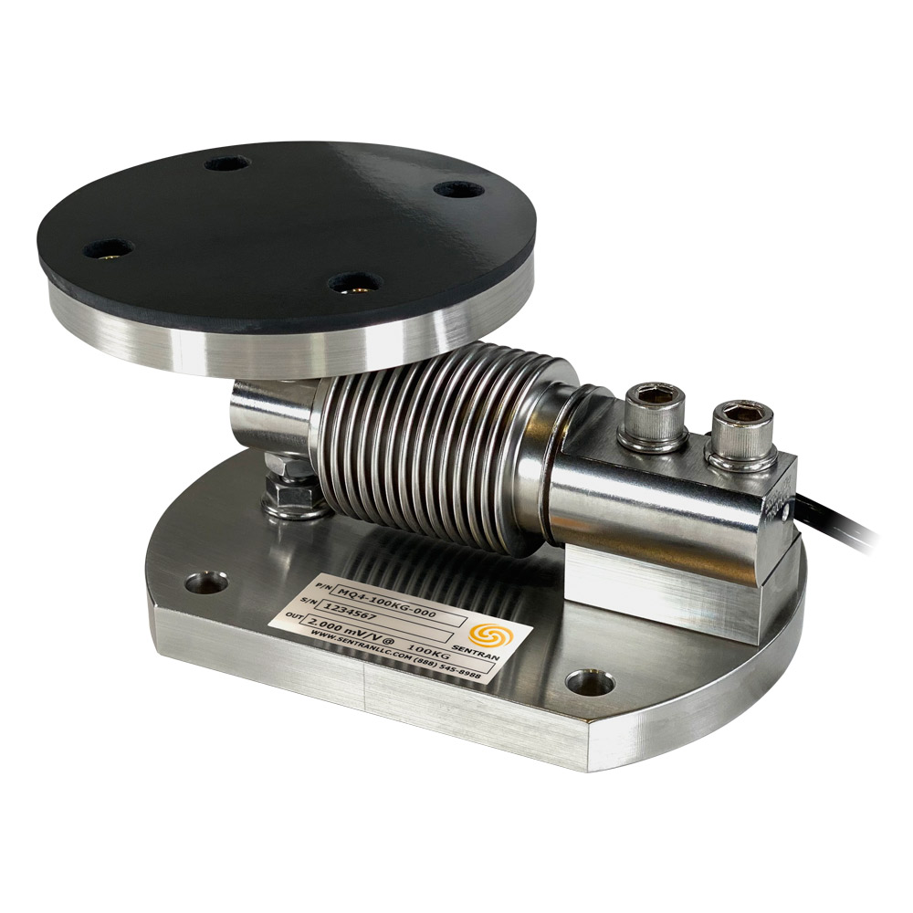 The MQ4 Series is a high performance weigh module constructed of stainless steel. The MQ4 utilizes the VE4-C Series dual-guided cantilever beam load cell that readily tolerates angular, eccentric, and side loading effects, with minimal sensitivity to these anomalies. The MQ4 Series is designed to accurately measure compression forces for applications ranging from 0-5 KG to 0-500 KG. The MQ4 Series includes factory adjusted integral overload protection for both compression and tension (uplift), yielding a safe overload rating of up to 500% of rated capacity. The included Viton LRP (Load Receiver Pad) promotes equal load distribution between adjacent weigh modules and reduces the effects of shock loading and vibration. The MQ4 Series load receiver plate articulates 3° in all directions, allowing intrinsic planar misalignment compensation, accommodating vessel support alignment, sloped flooring, thermal expansion/contraction, and other installation variables. This easy-to-install weigh module mounts directly to the floor or structural supports, and is completely self-checking, including uplift constraint with accurate (tension) measurement. The MQ4 Series weigh module is Harsh Environment Sealed to IP68, incorporating a welded bellows seal to protect all internal components. The integral premium, instrumentation grade cable features a durable PVC jacket over a tinned-copper braided shield for superior mechanical protection and to minimize the unwanted electrical effects of RFI and EMI. The attributes of the MQ4 Series make it an ideal choice for measurement in C-I-P (Clean in Place) process, Pharmaceutical, Industrial, precious material handling, and weighing situations where a versatile high performance, low capacity weigh module solution is required.