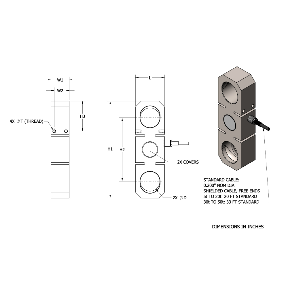 | CAPACITY (t) | D | H1 | H2 | H3 | L | W1 | W2 | T (THREAD) | DEFLECT | WEIGHT |